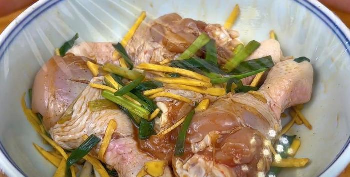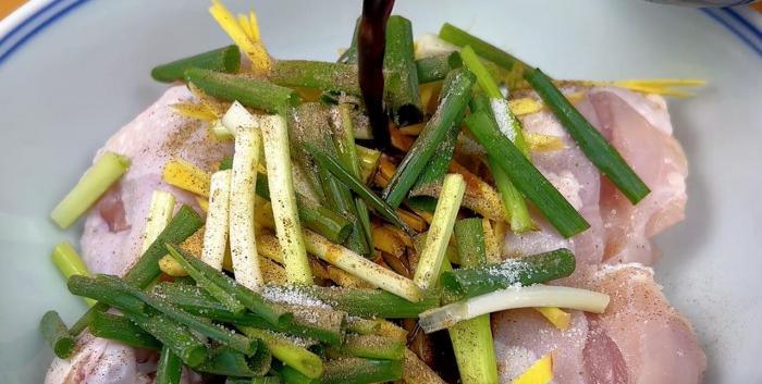 3.雞腿放入盆中,調入生薑絲跟一把蔥段,加入鹽、胡椒粉,少許生抽,抓拌均勻醃製入味。最好把蔥薑汁水抓出來,增香又去腥。