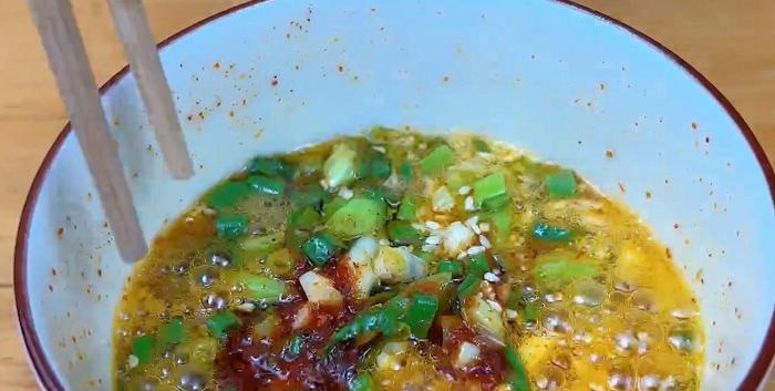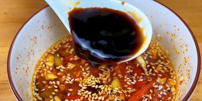8.再把炸花生米的油淋入調料碗中激發一下香氣。