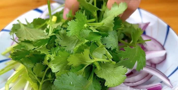 5.準備一些配菜,自己喜歡吃的就可以。半個洋蔥切絲,香菜切段。