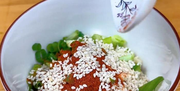 6.小米辣切圈、大蒜切末、香蔥切蔥花放入碗中,調入一勺辣椒麵跟白芝麻。