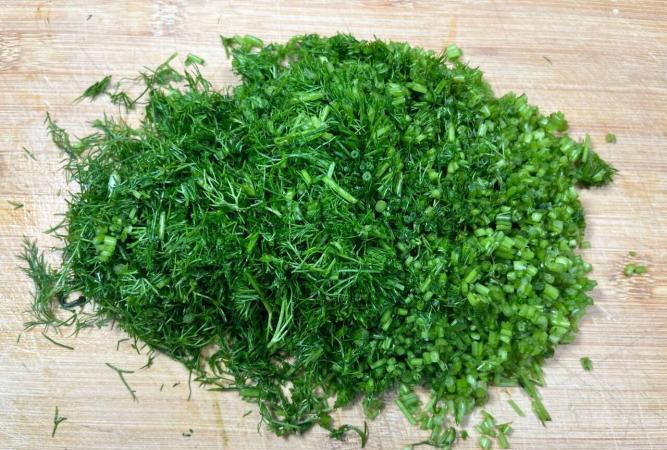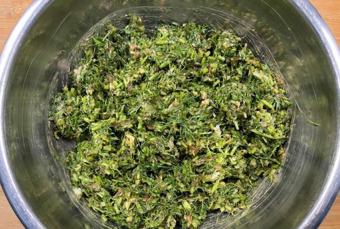 首先把新鮮的茴香菜擇一下不好的葉子,然後用清水沖洗乾淨後控下水分,最後把茴香菜切成小碎丁,切好的茴香放入大點的容器內,放一勺熟食用油拌均勻,這樣茴香菜既能鎖住水分,還會更翠綠。