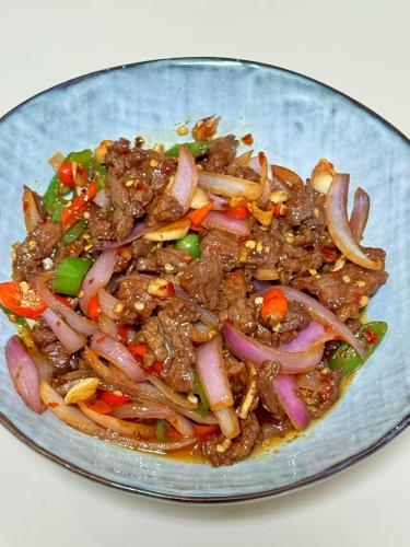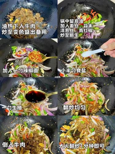 食材:牛肉,洋蔥,青椒,小米椒,姜,蒜