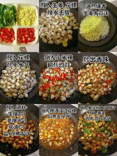 2. 起鍋燒油,油熱倒入生薑大蒜沫爆香,放入花螺炒幹水汽。在放入小米辣炒出香味,放入調料:生抽2勺,老抽1勺,耗油1勺,鹽,白糖少許翻炒均勻。倒入啤酒沒過花螺,蓋蓋燜煮五分鐘。然後倒入水澱粉,雞精,蔥段即可出鍋。